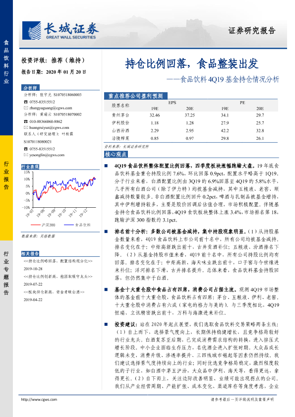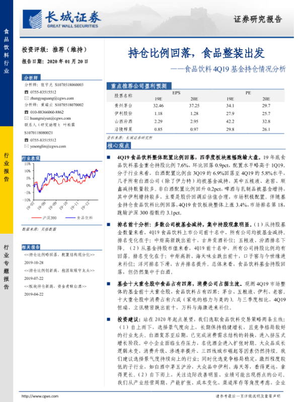 【长城证券】【20200120】食品饮料4Q19基金持仓情况分析:持仓比例回落,食品整装出发-7页