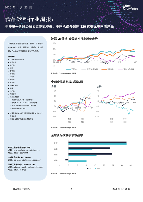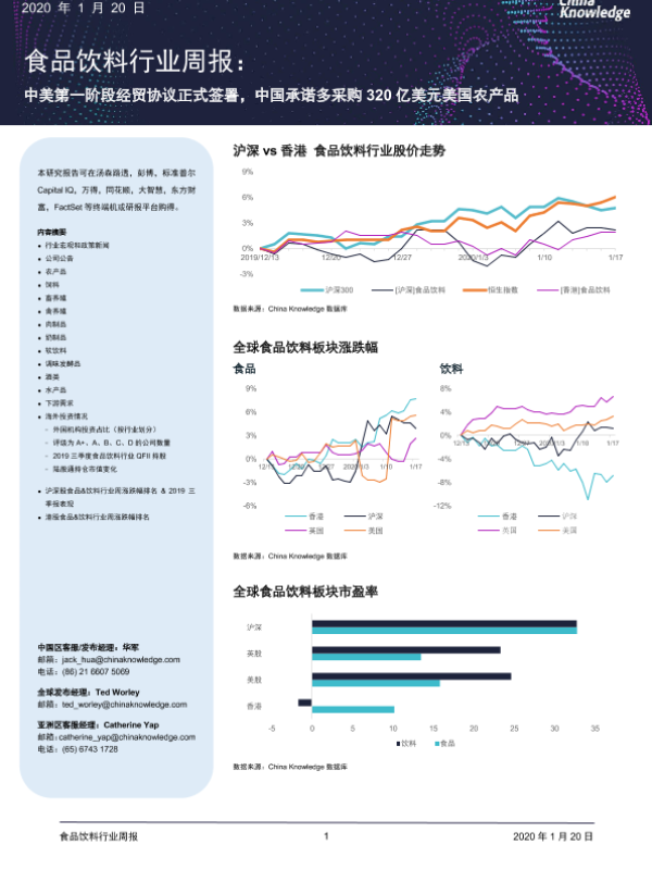 【China Knowledge】【20200120】食品饮料行业周报:中美第一阶段经贸协议正式签署,中国承诺多采购320亿美元美国农产品-29页