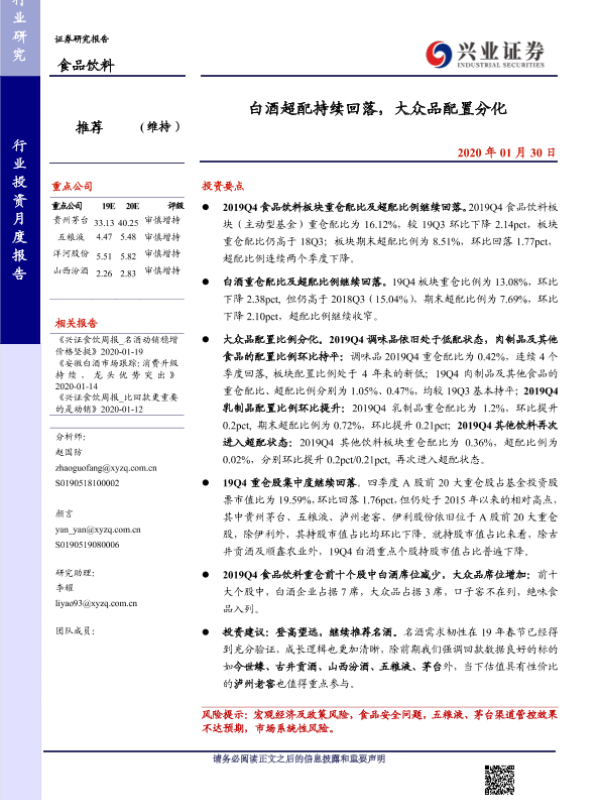 【兴业证券】【20200130】20200130-兴业证券-食品饮料行业投资月度报告:白酒超配持续回落,大众品配置分化-10页