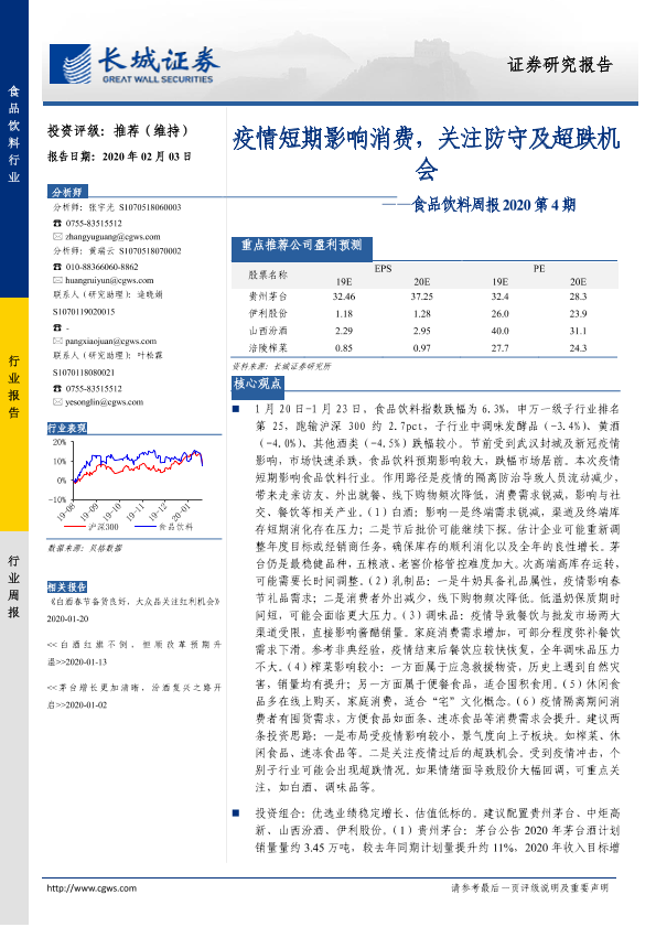 【长城证券】【20200203】食品饮料周报2020第4期:疫情短期影响消费,关注防守及超跌机会-11页