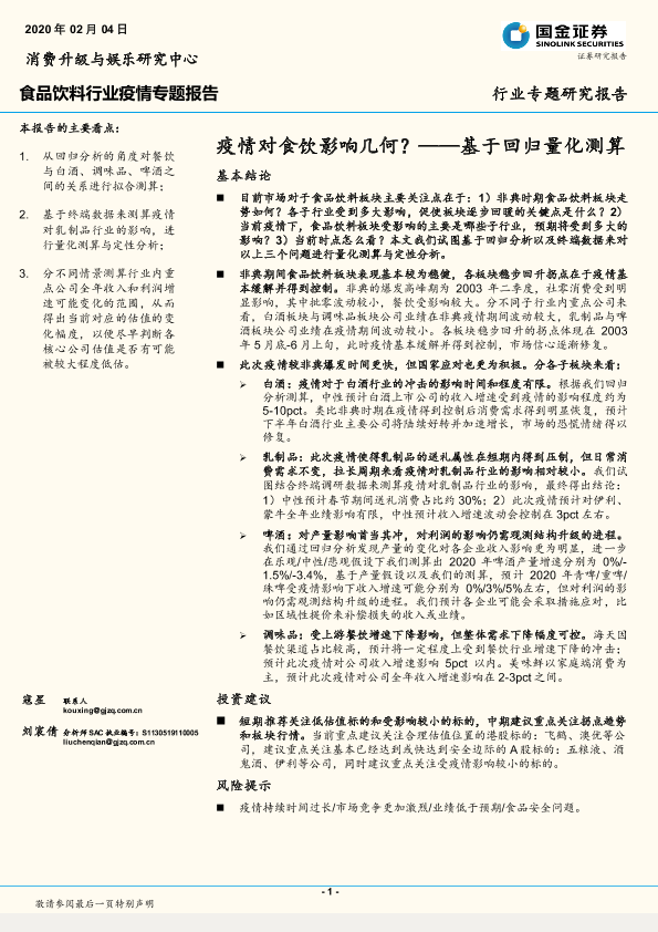 【国金证券】【20200204】20200204-国金证券-食品饮料行业疫情专题报告:疫情对食饮影响几何?——基于回归量化测算-25页