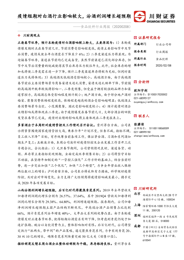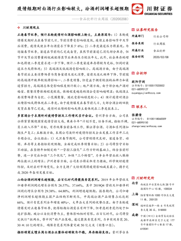 【川财证券】【20200208】食品饮料行业周报:疫情短期对白酒行业影响较大,汾酒利润增长超预期-15页
