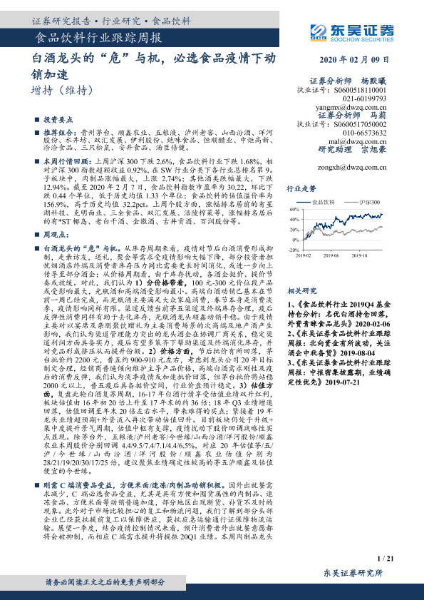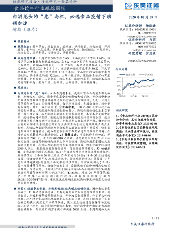【东吴证券】【20200209】20200209-东吴证券-食品饮料行业跟踪周报:基础建设年,稳中求进取白酒龙头的“危”与机,必选食品疫情下动销加速-21页