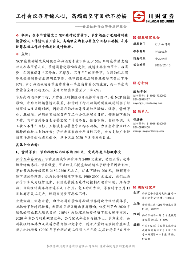 【川财证券】【20200210】食品饮料行业事件点评报告:工作会议召开稳人心,高端酒坚守目标不动-6页