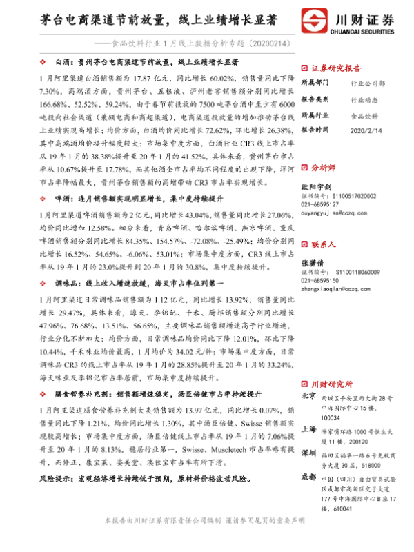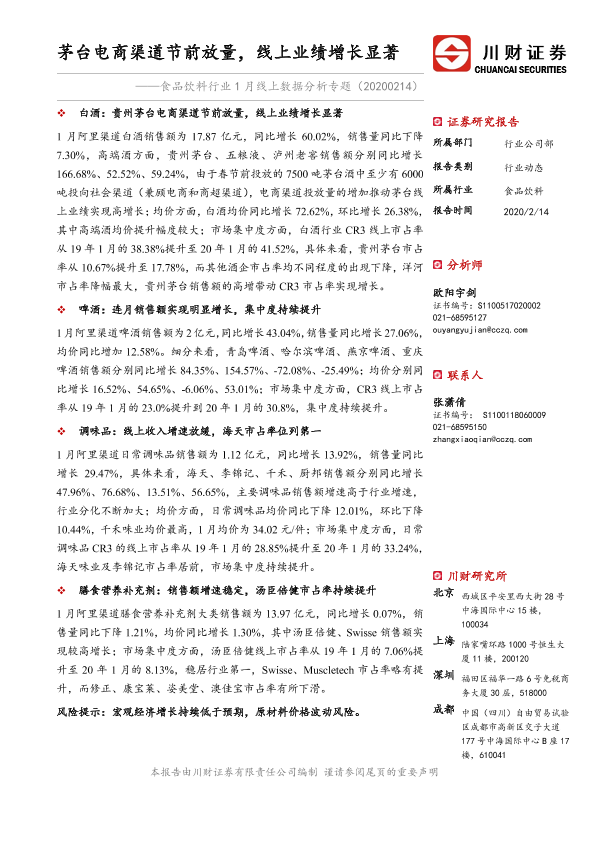 【川财证券】【20200214】食品饮料行业1月线上数据分析专题:茅台电商渠道节前放量,线上业绩增长显著-16页