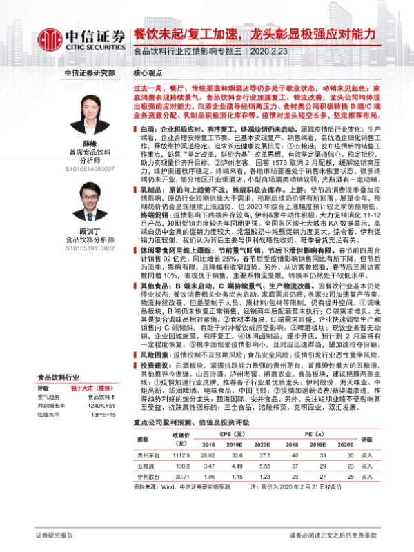 【中信证券】【20200223】食品饮料行业疫情影响专题三:餐饮未起 复工加速,龙头彰显极强应对能力-14页