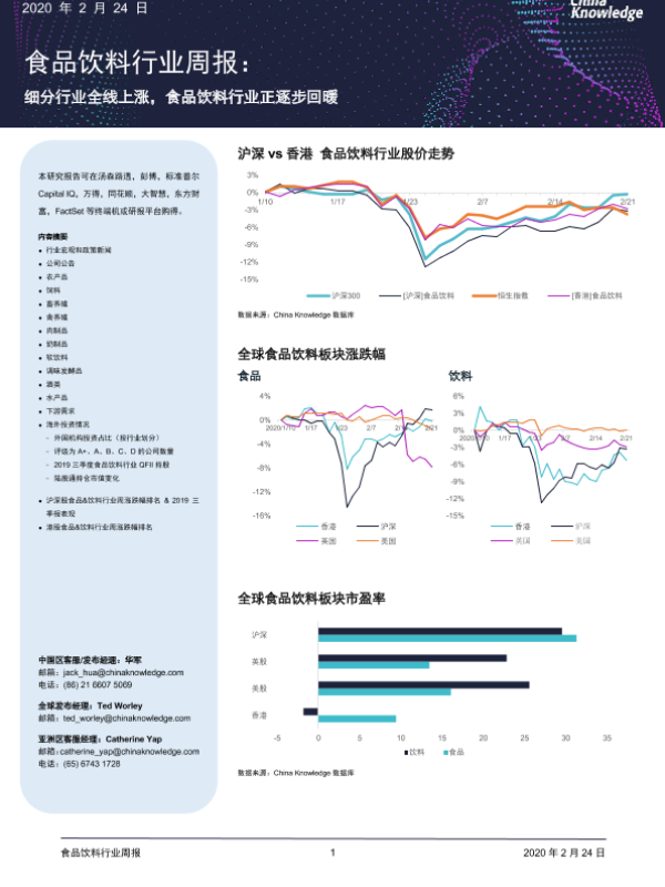 【China Knowledge】【20200224】食品饮料行业周报:细分行业全线上涨,食品饮料行业正逐步回暖-29页