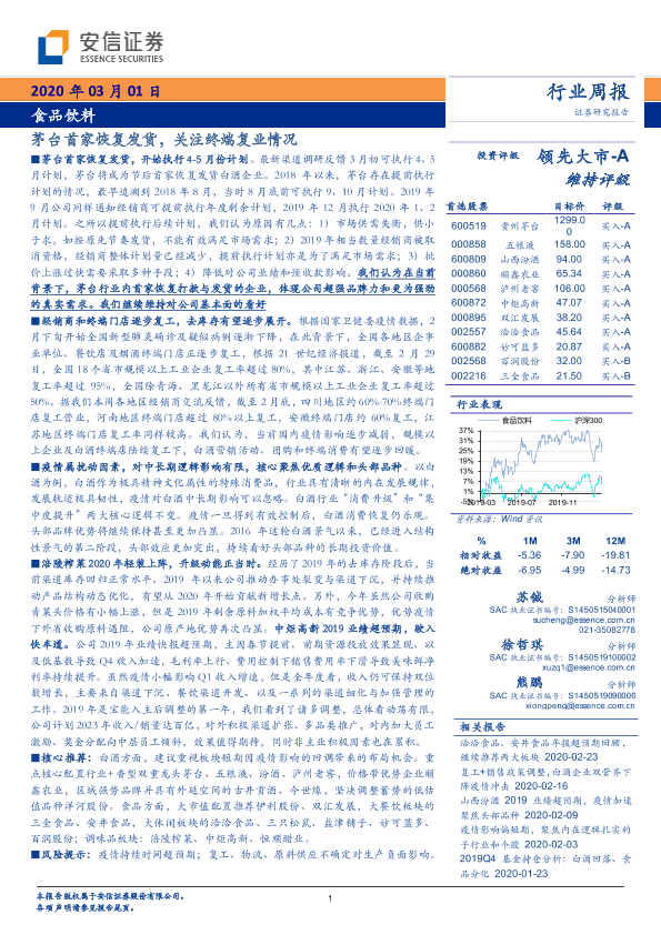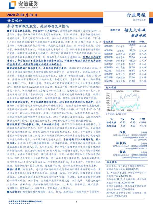 【安信证券】【20200301】20200301-安信证券-食品饮料行业周报:茅台首家恢复发货,关注终端复业情况-22页