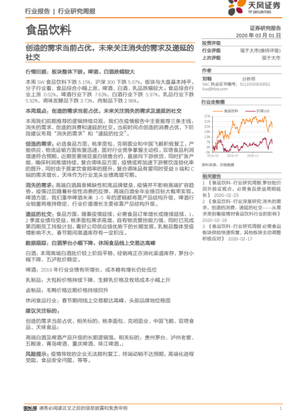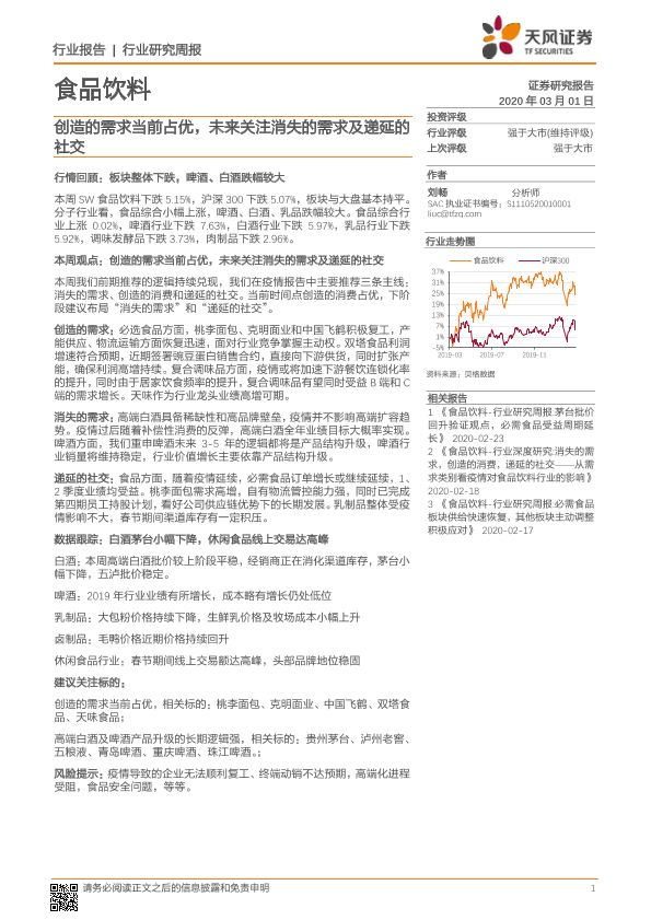 【天风证券】【20200301】20200301-天风证券-食品饮料行业研究周报:创造的需求当前占优,未来关注消失的需求及递延的社交-17页