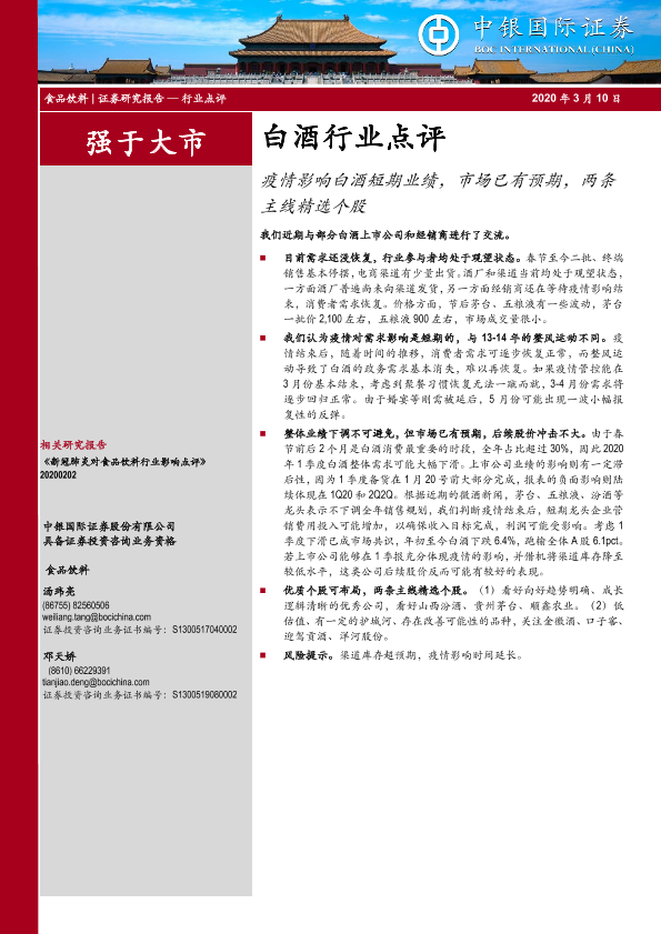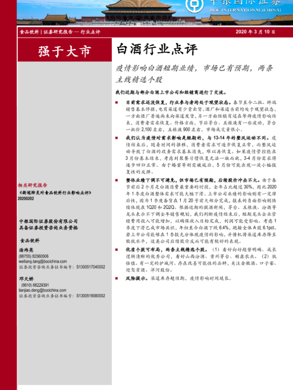 【中银证券】【20200310】20200310-中银证券-白酒行业点评:疫情影响白酒短期业绩,市场已有预期,两条主线精选个股-4页