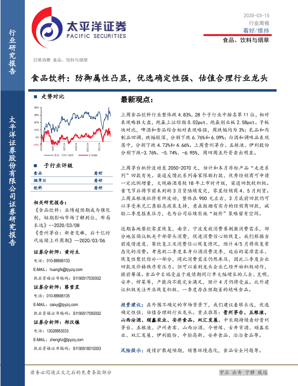 【太平洋证券】【20200315】食品饮料:防御属性凸显,优选确定性强、估值合理行业龙头-9页