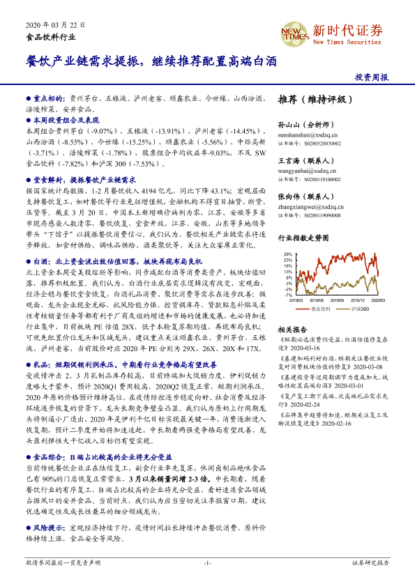 【新时代证券】【20200322】20200322-新时代证券-食品饮料行业投资周报:餐饮产业链需求提振,继续推荐配置高端白酒-18页