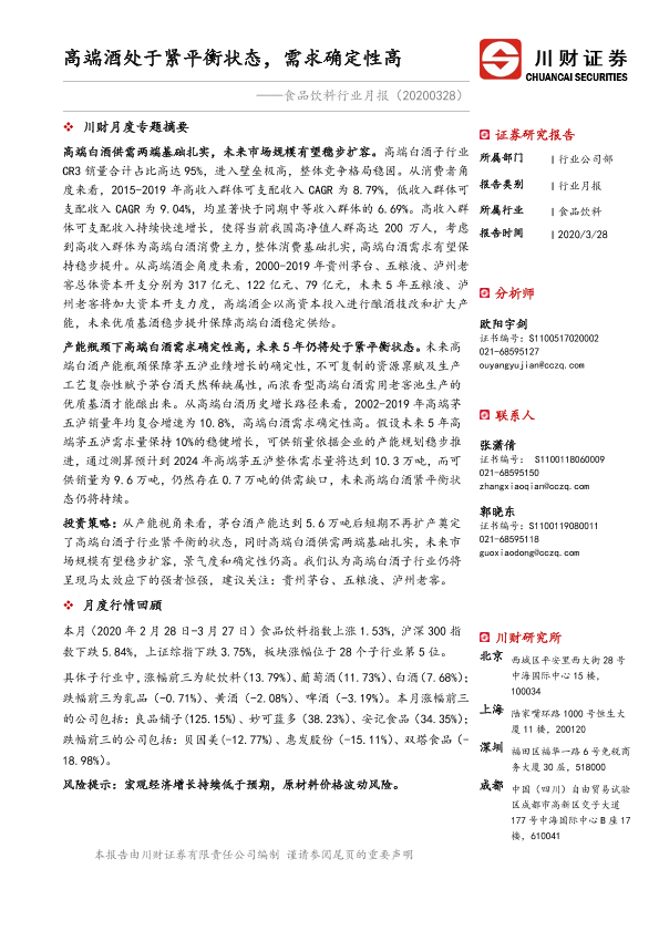 【川财证券】【20200328】20200328-川财证券-食品饮料行业月报:高端酒处于紧平衡状态,需求确定性高-27页