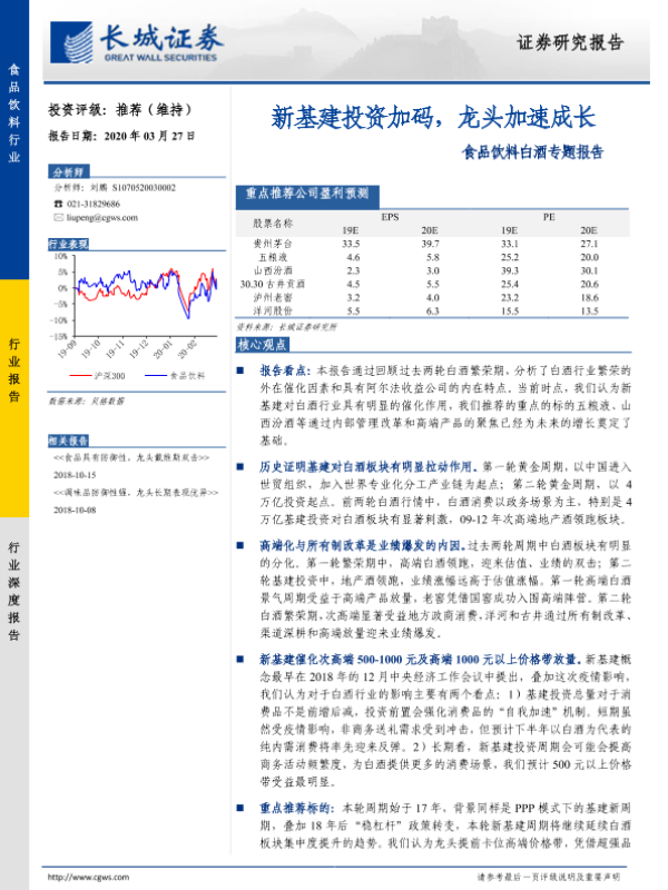 【长城证券】【20200327】20200327-长城证券-食品饮料白酒专题报告:新基建投资加码,龙头加速成长-16页