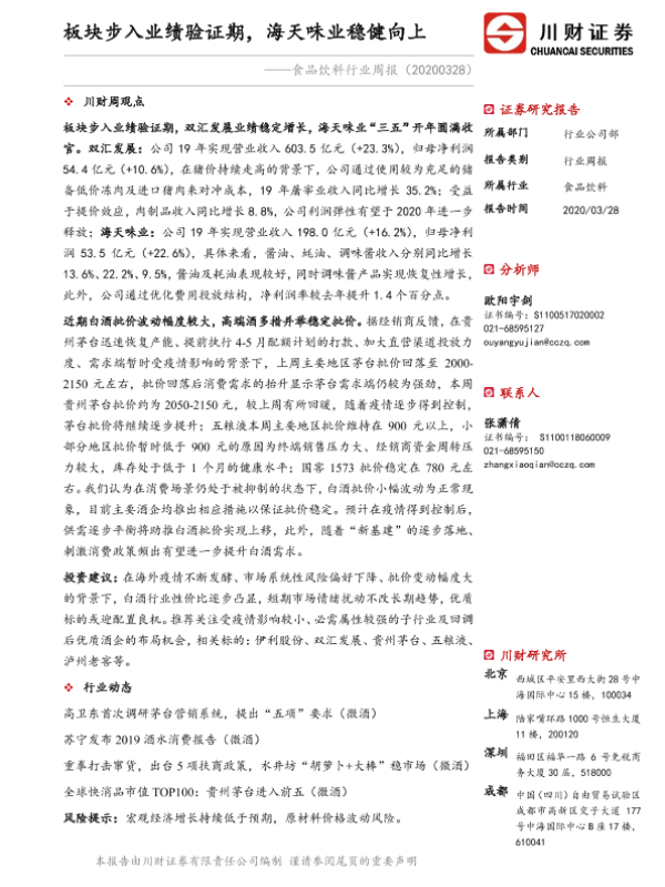 【川财证券】【20200328】食品饮料行业周报:板块步入业绩验证期,海天味业稳健向上-16页