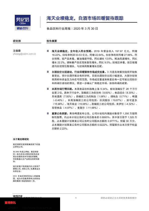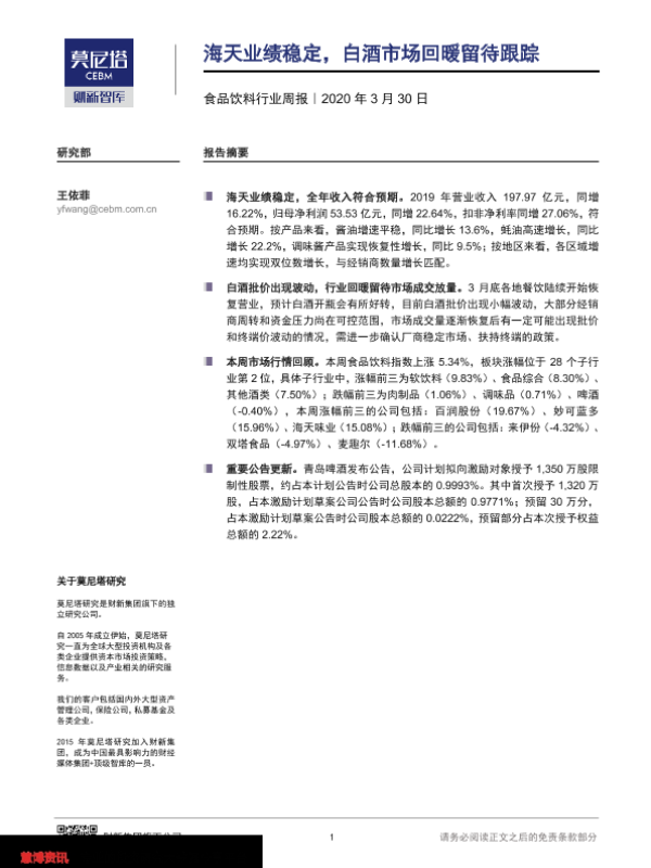 【莫尼塔研究】【20200330】20200330-莫尼塔投资-食品饮料行业周报:海天业绩稳定,白酒市场回暖留待跟踪-4页