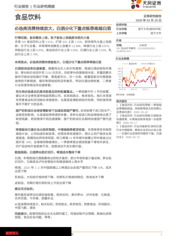 【天风证券】【20200329】20200329-天风证券-食品饮料行业研究周报:必选类消费持续放大,白酒分化下重点推荐高端白酒-10页