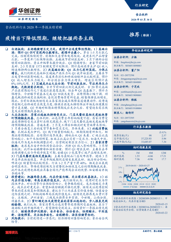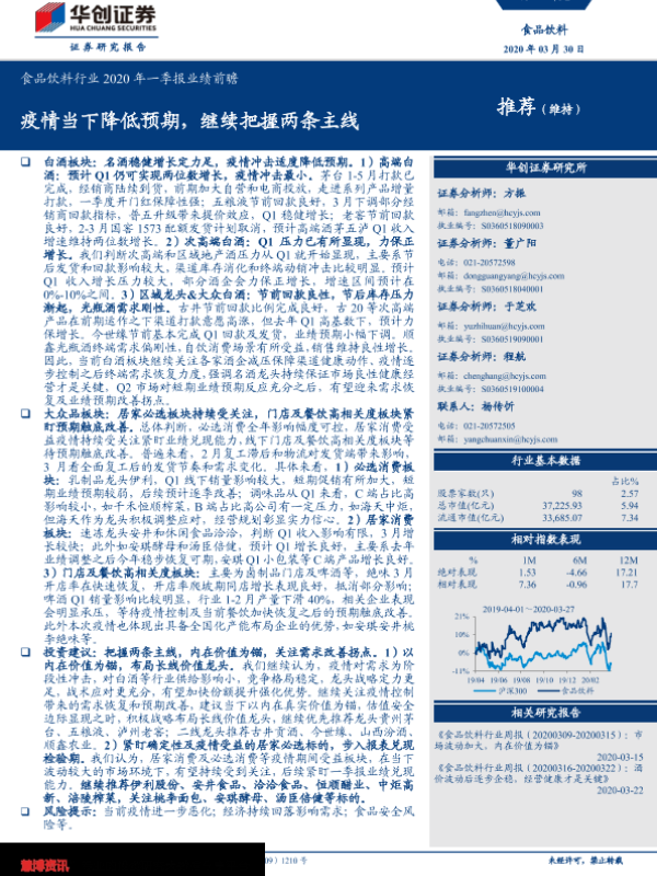 【华创证券】【20200330】食品饮料行业2020年一季报业绩前瞻:疫情当下降低预期,继续把握两条主线-11页