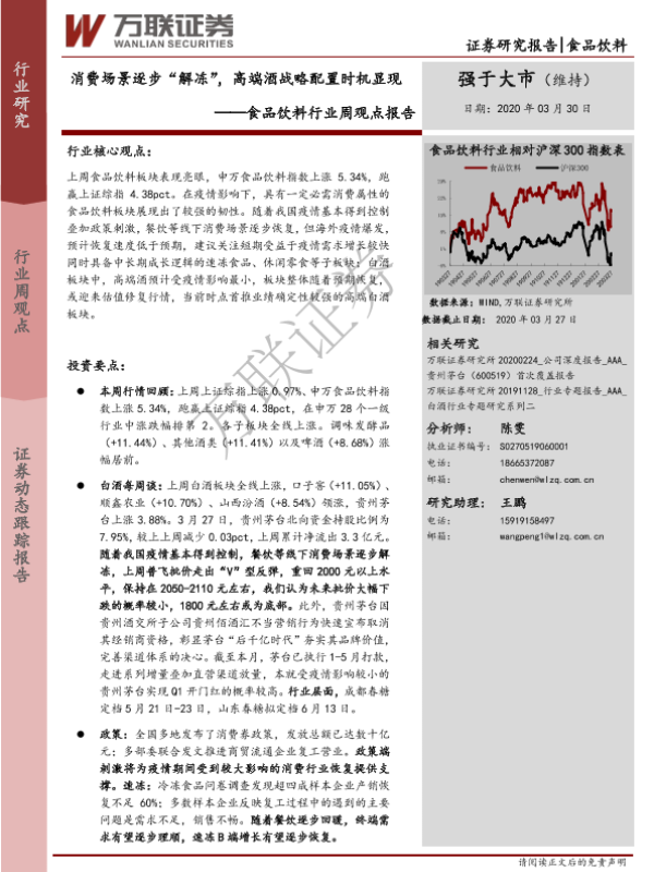 【万联证券】【20200330】20200330-万联证券-食品饮料行业周观点报告:消费场景逐步“解冻”,高端酒战略配置时机显现-12页