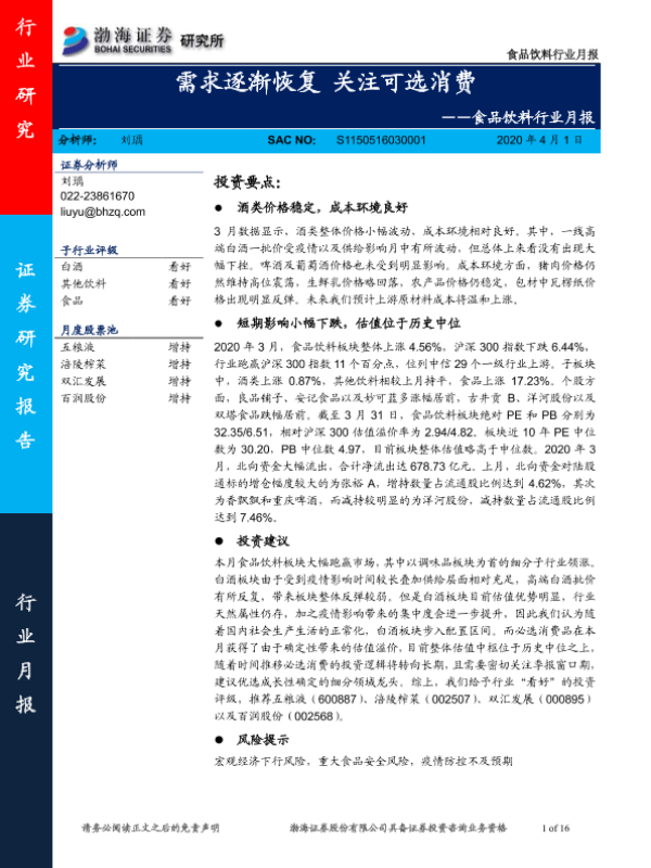 【渤海证券】【20200401】20200401-渤海证券-食品饮料行业月报:需求逐渐恢复 关注可选消费-16页