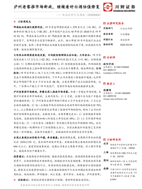 【川财证券】【20200404】20200404-川财证券-食品饮料行业周报:泸州老窖推市场新政,继续看好白酒估值修复-14页