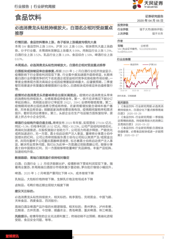 【天风证券】【20200405】20200405-天风证券-食品饮料行业研究周报:必选消费龙头粘性持续放大,白酒名企相对受益重点推荐-8页