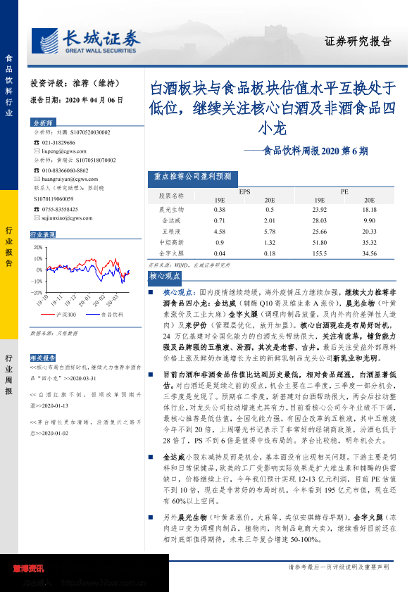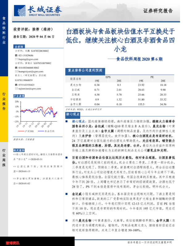 【长城证券】【20200406】食品饮料周报2020第6期:白酒板块与食品板块估值水平互换处于低位,继续关注核心白酒及非酒食品四小龙-14页