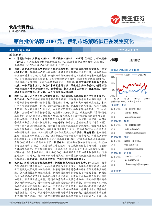 【民生证券】【20200407】20200407-民生证券-食品饮料行业周报:茅台批价站稳2100元,伊利市场策略似正在发生变化-23页