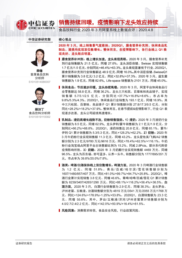 【中信证券】【20200408】食品饮料行业2020年3月阿里系线上数据点评:销售持续回暖,疫情影响下龙头效应持续-11页