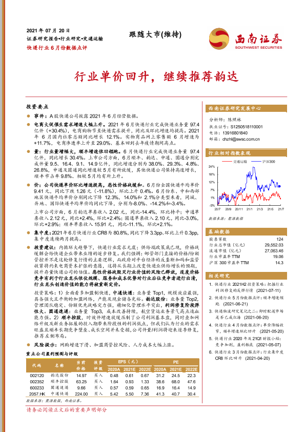 【西南证券】【20210720】快递行业6月份数据点评:行业单价回升,继续推荐韵达-11页