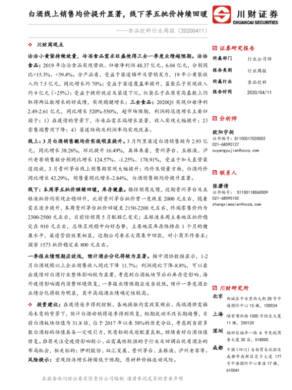 【川财证券】【20200411】20200411-川财证券-食品饮料行业周报:白酒线上销售均价提升显著,线下茅五批价持续回暖-14页