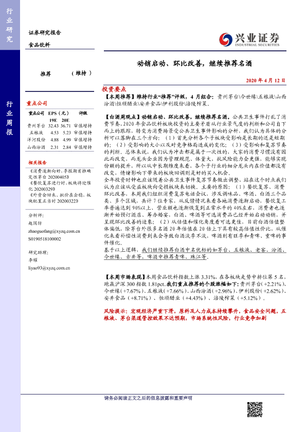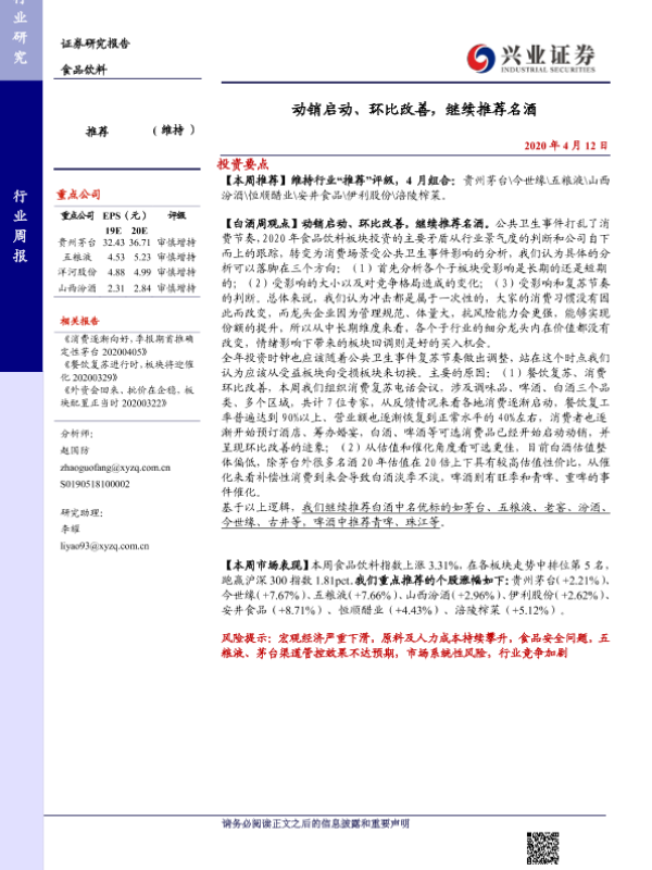 【兴业证券】【20200412】20200412-兴业证券-食品饮料行业周报:动销启动、环比改善,继续推荐名酒-16页