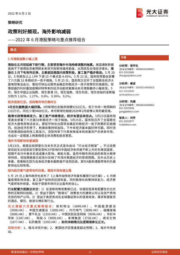【光大证券】【20220602】2022年6月港股策略与重点推荐组合:政策利好频现,海外影响减弱-18页