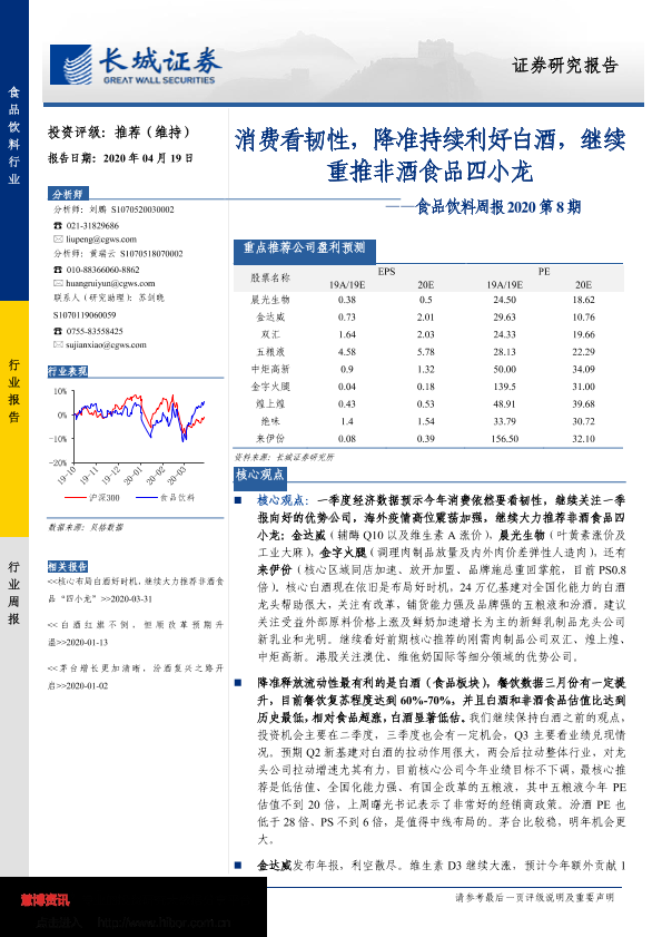 【长城证券】【20200419】食品饮料周报2020第8期:消费看韧性,降准持续利好白酒,继续重推非酒食品四小龙-14页