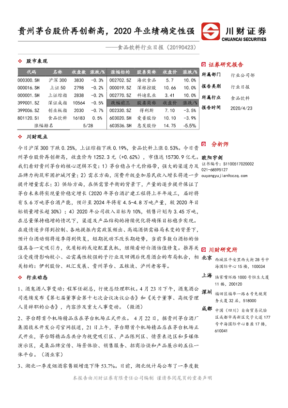 【川财证券】【20200423】贵州茅台股价再创新高,2020年业绩确定性强-3页