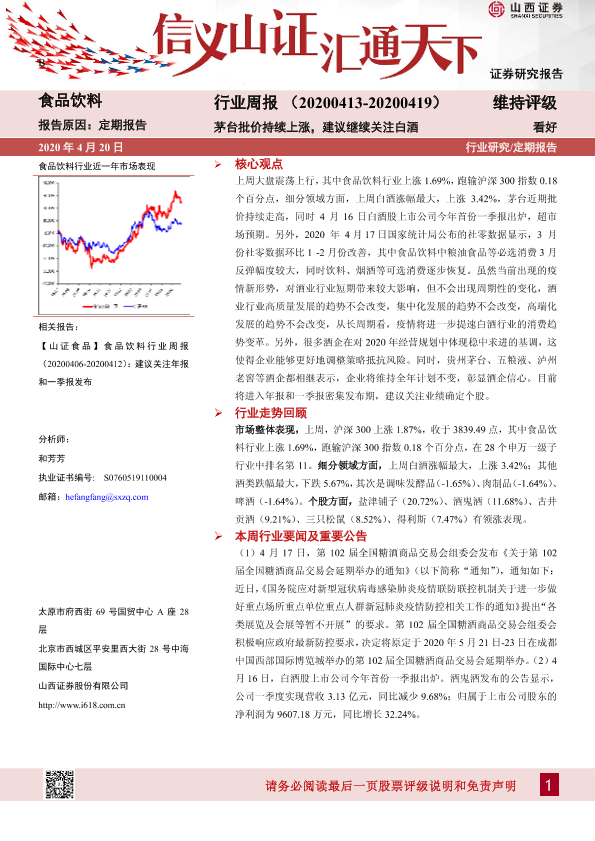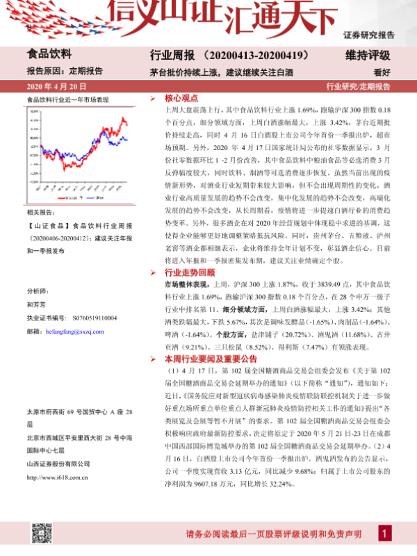 【山西证券】【20200420】20200420-山西证券-食品饮料行业周报:茅台批价持续上涨,建议继续关注白酒-12页