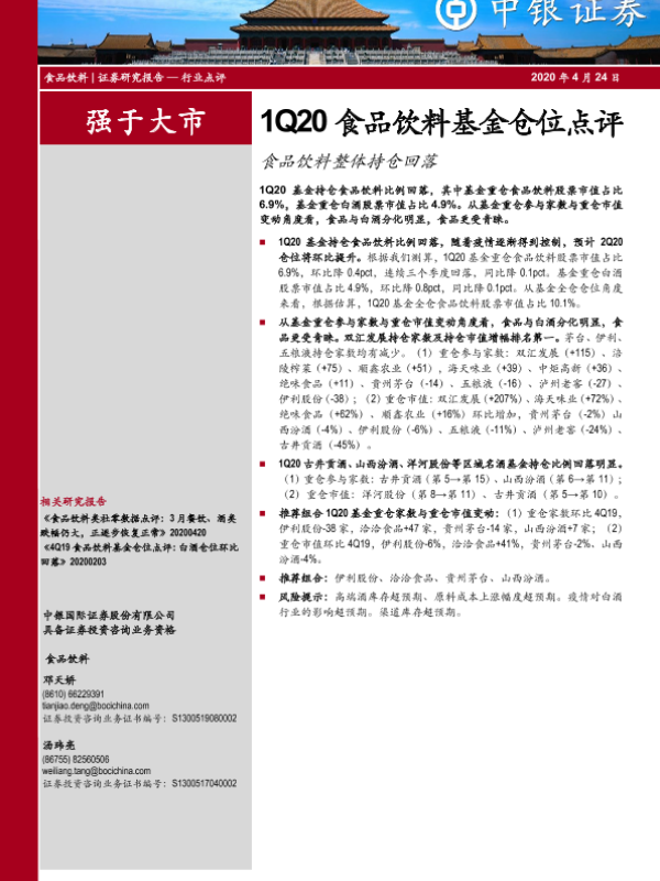 【中银证券】【20200424】1Q20食品饮料基金仓位点评:食品饮料整体持仓回落-7页