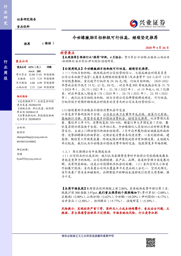 【兴业证券】【20200426】20200426-兴业证券-食品饮料行业周报:今世缘激励目标积极可行性高,继续坚定推荐-17页