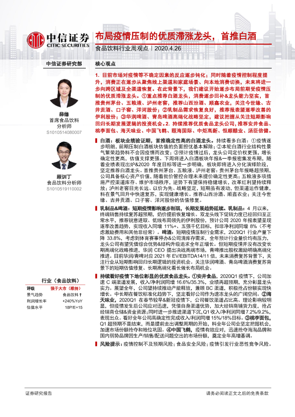 【中信证券】【20200426】20200427-中信证券-食品饮料行业周观点:布局疫情压制的优质滞涨龙头,首推白酒-13页
