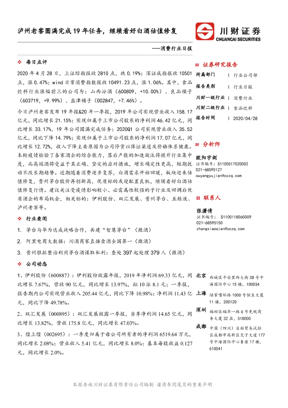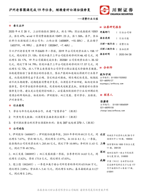 【川财证券】【20200428】消费行业日报:泸州老窖圆满完成19年任务,继续看好白酒估值修复-4页