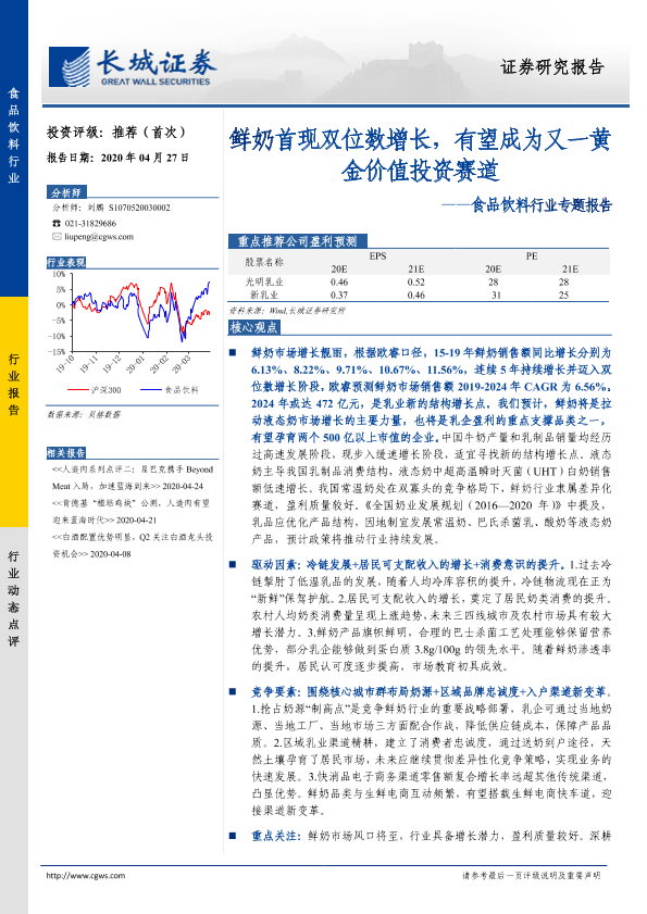 【长城证券】【20200427】20200427-长城证券-食品饮料行业专题报告:鲜奶首现双位数增长,有望成为又一黄金价值投资赛道-15页