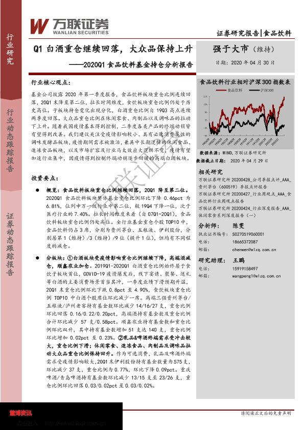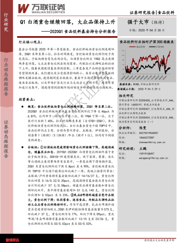 【万联证券】【20200430】2020Q1食品饮料基金持仓分析报告:Q1白酒重仓继续回落,大众品保持上升-14页