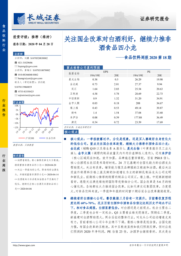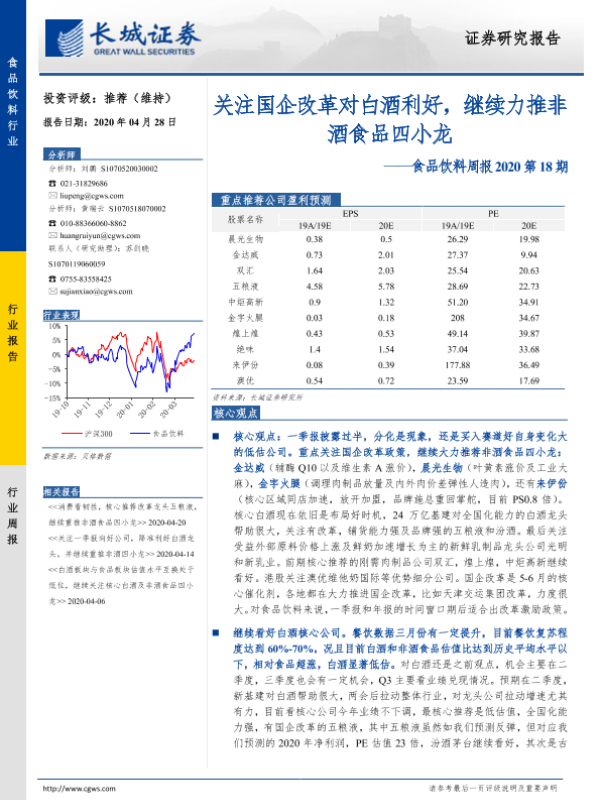 【长城证券】【20200428】20200428-长城证券-食品饮料周报2020第18期:关注国企改革对白酒利好,继续力推非酒食品四小龙-16页