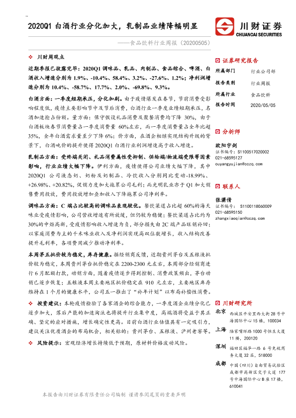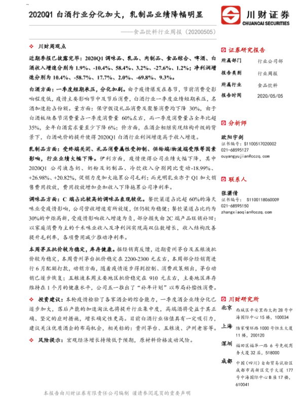 【川财证券】【20200505】20200505-川财证券-食品饮料行业周报:2020Q1白酒行业分化加大,乳制品业绩降幅明显-15页