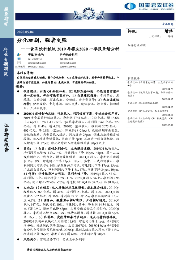 【国泰君安证券】【20200504】食品饮料板块2019年报&2020一季报业绩分析:分化加剧,强者更强-27页