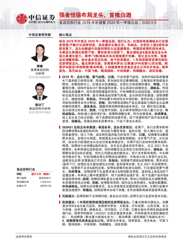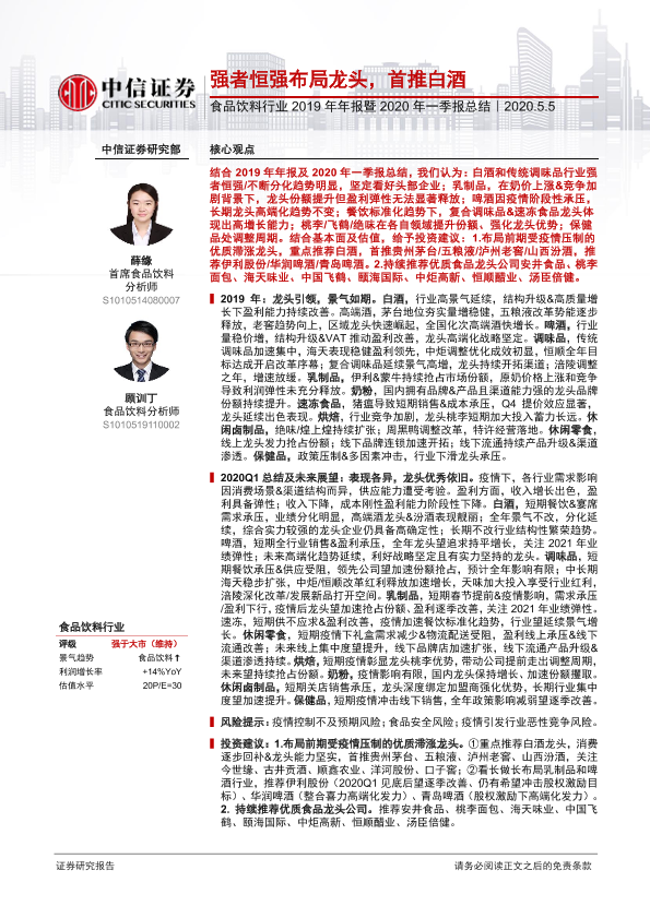 【中信证券】【20200505】食品饮料行业2019年年报暨2020年一季报总结:强者恒强布局龙头,首推白酒-26页