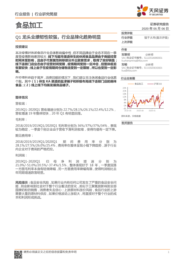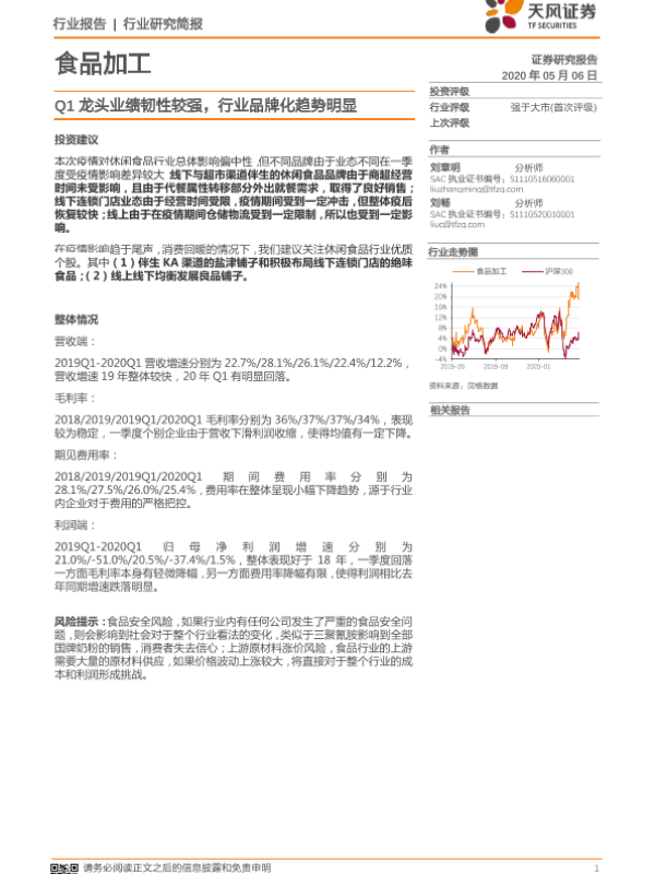 【天风证券】【20200506】20200506-天风证券-食品加工行业研究简报:Q1龙头业绩韧性较强,行业品牌化趋势明显-7页
