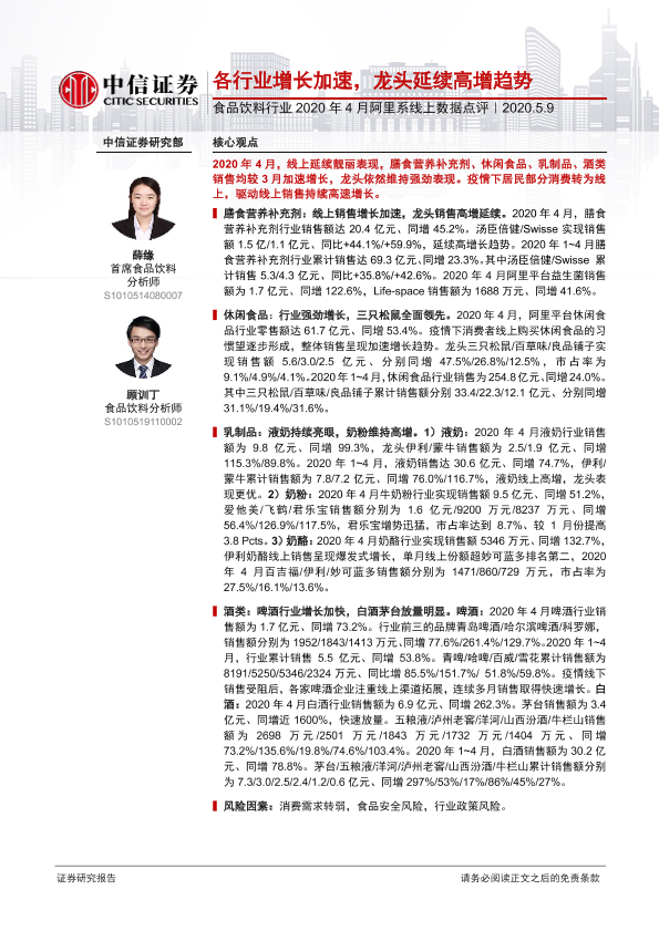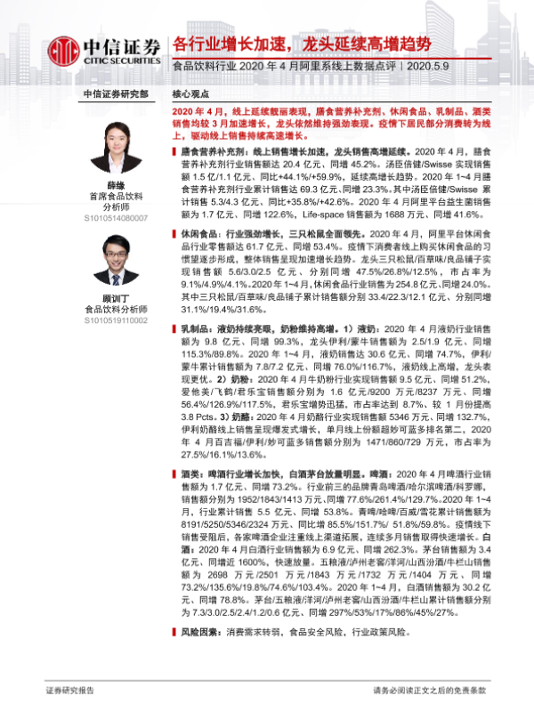 【中信证券】【20200509】食品饮料行业2020年4月阿里系线上数据点评:各行业增长加速,龙头延续高增趋势-10页