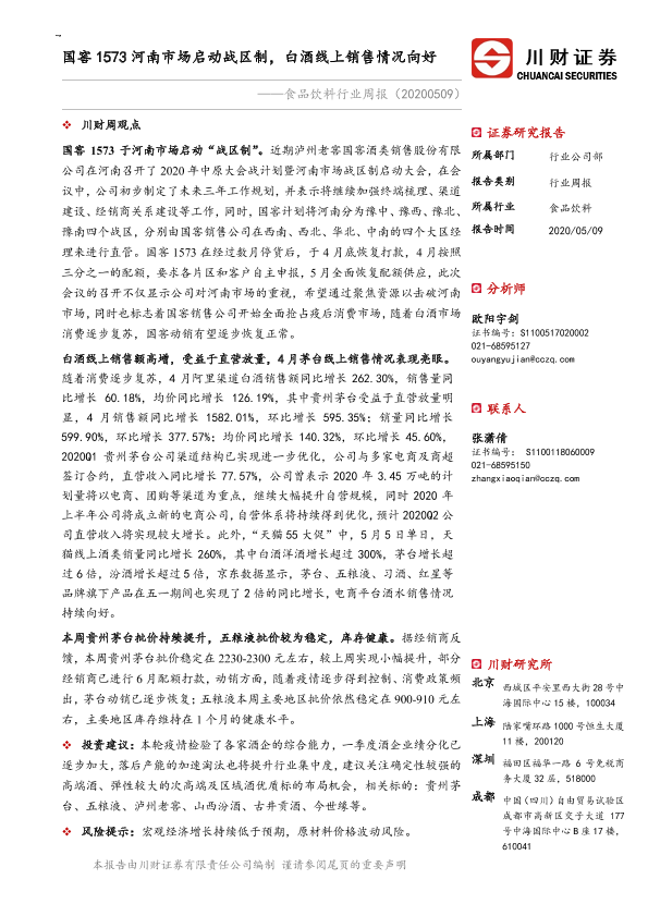 【川财证券】【20200509】食品饮料行业周报:国窖1573河南市场启动战区制,白酒线上销售情况向好-13页