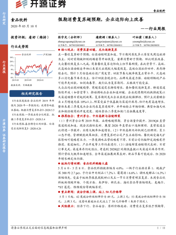 【开源证券】【20200510】20200510-开源证券-食品饮料行业周报:假期消费复苏超预期,企业边际向上改善-11页